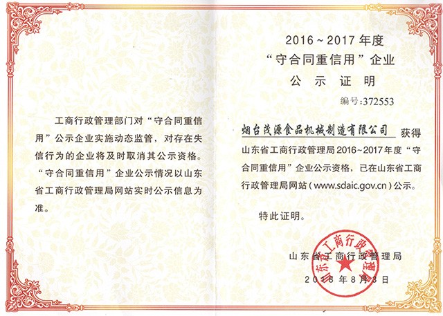 熱烈慶祝煙臺(tái)茂源食品機(jī)械制造有限公司獲得2016-2017年度“守合同重信譽(yù)”榮譽(yù)證書(shū)