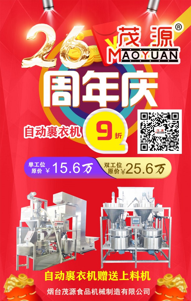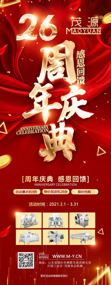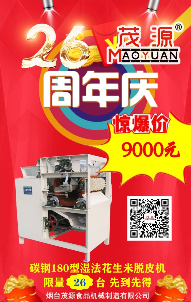 煙臺茂源食品機(jī)械即將迎來26周年慶,為感謝新老客戶長期以來的支持與信任,現(xiàn)特推出以下感恩回饋活動:單工位、雙工位自動裹衣機(jī)原價15.6萬元、25.6萬元基礎(chǔ)上降價10%,并隨機(jī)贈上料機(jī);碳鋼180型濕法花生米脫皮機(jī)特價9000元,限量26臺,先到先得!